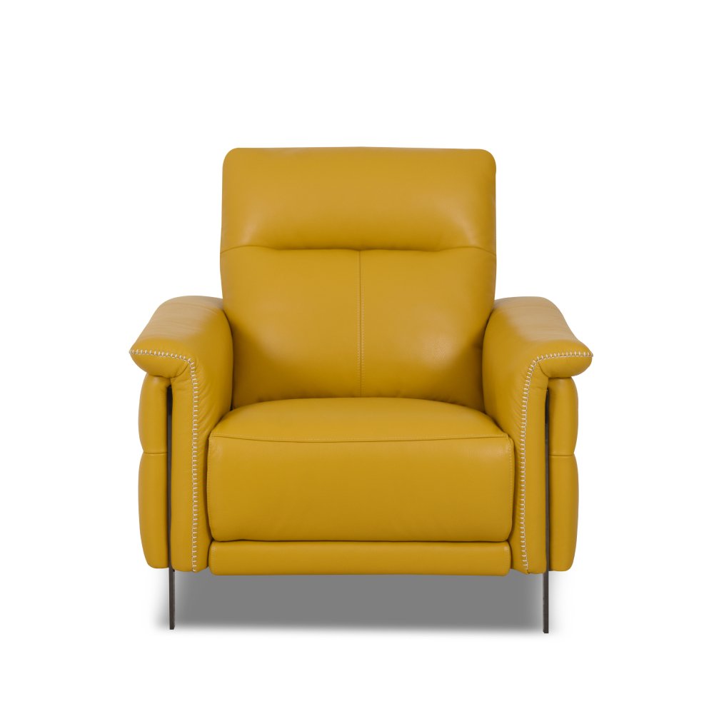 Sunshine is a high back, open base design with an unique double layer slim arm enhanced by a metal insert and decorative contrast stitching. Independent electric mechanisms, with fold-out footrest, comes with multi-functional remote and USB connection. Seat cushion in bi density HR foam. Back cushion in HR foam. No sag spring seat suspension Base in black chrome polish nickle plated. Optional base in pearl white metal finish. Also available in other dimensions, as a straight sofa, armchair, sectional and terminal. Stationary options available (Stationary options comes with manual headrests).